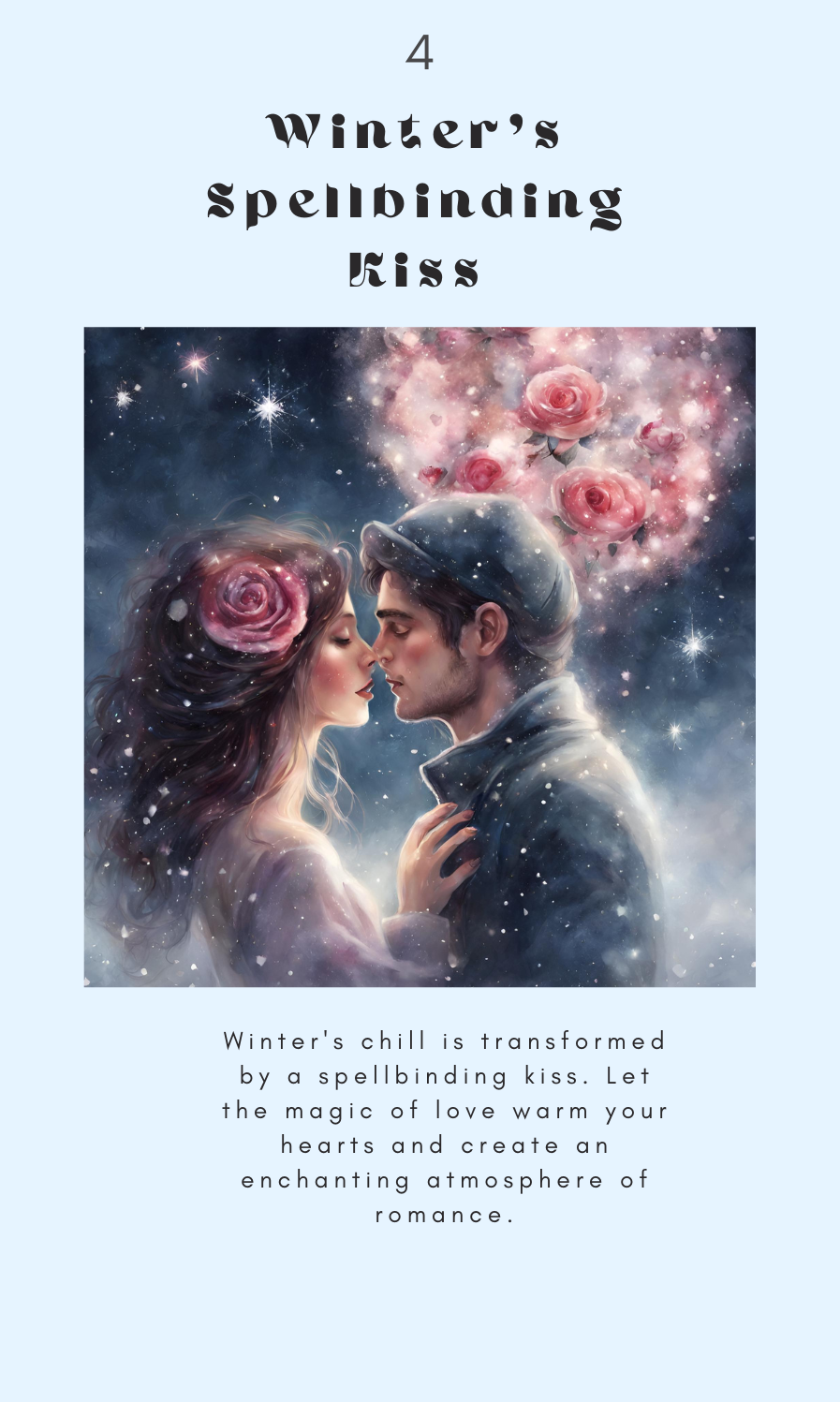 Winter's chill is transformed by a spellbinding kiss. Let the magic of love warm your hearts and create an enchanting atmosphere of romance.